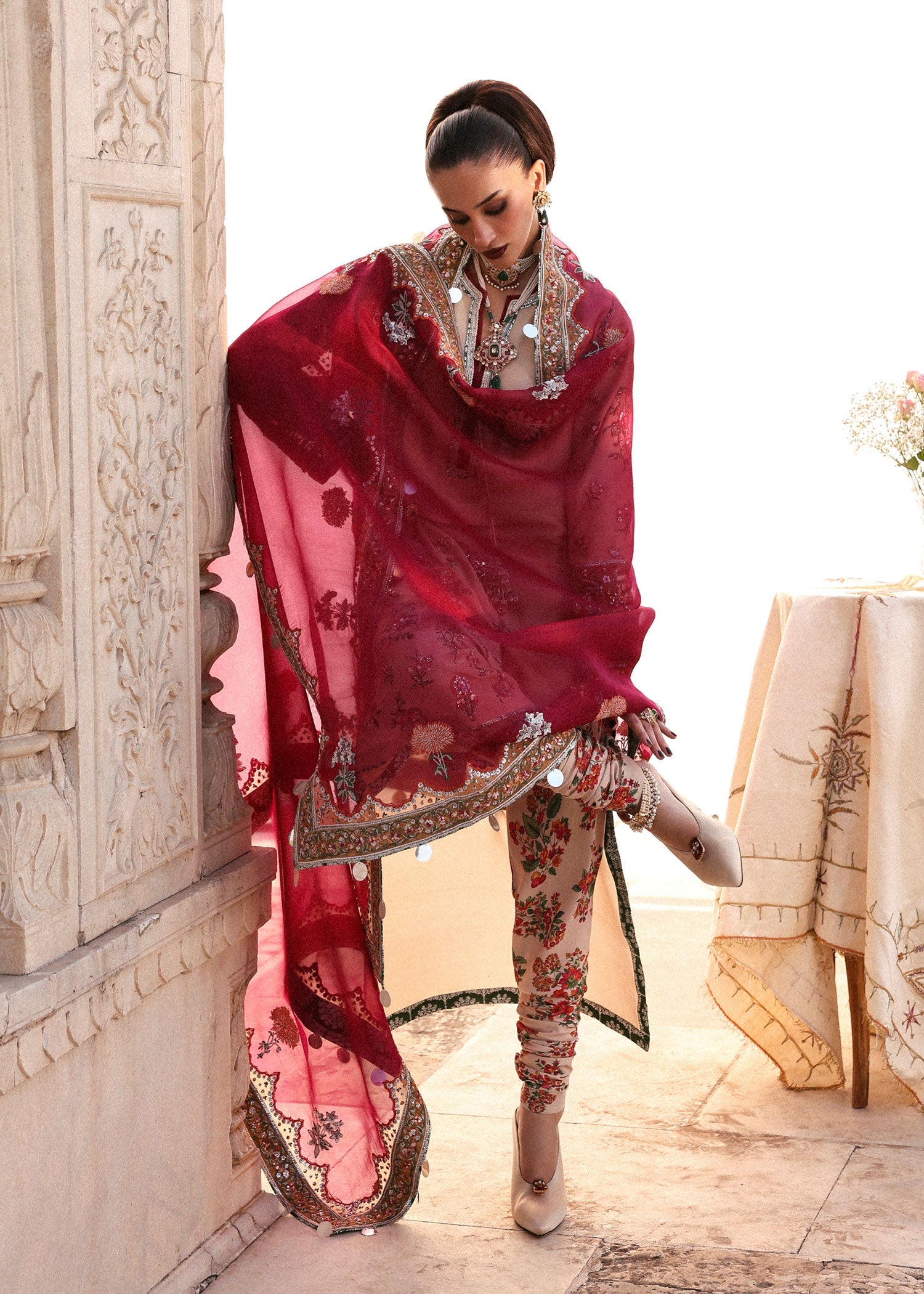 Light beige raw silk long straight shirt embellished with multicolored floral embroidery on the front and sleeves, finished with mustard and plum organza cuffs and a tasseled neckline. Paired with a printed raw silk churidar and a plum organza dupatta edged with scalloped yellow organza, green chanderi trims, and silver sequin tassels