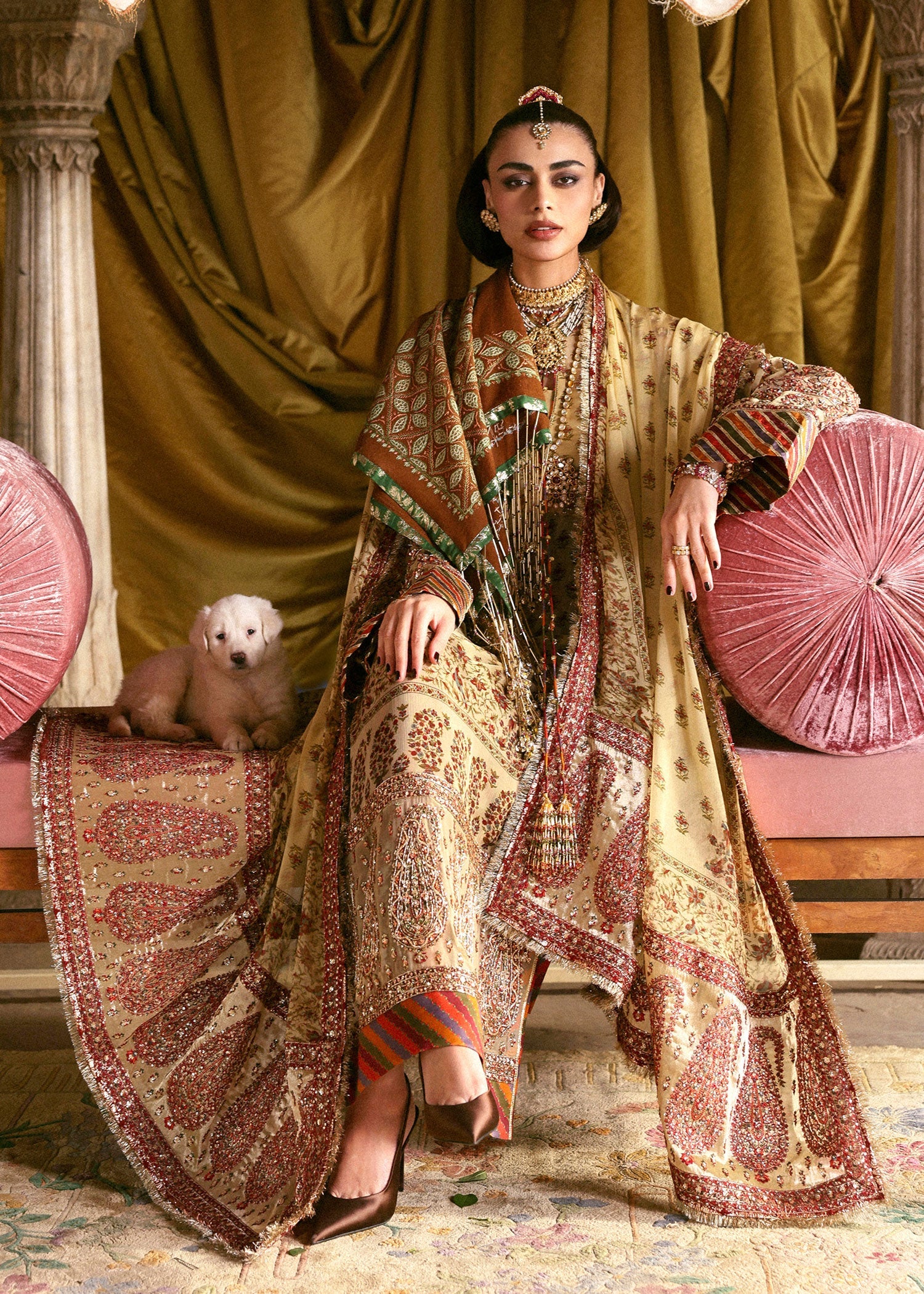 Butter yellow printed chiffon long shirt with embellished hem borders, sleeves, and tassel detailing, finished with printed chatta patti and gota on the sleeves. Paired with printed chiffon ankle-length straight pants and a matching printed chiffon dupatta featuring embroidered tissue borders and kiran lace accents on all four sides.