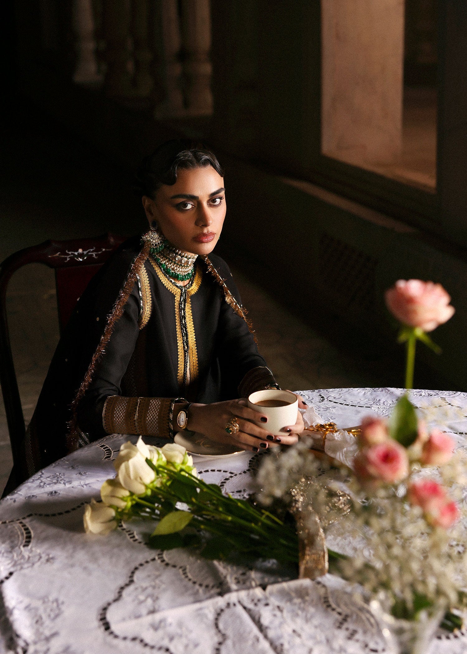 Black raw silk short shirt framed with banarsi borders on all sides and the sleeves hems. Paired with a matching Pakistani shalwar featuring banarsi borders and tissue hem accents. Completed with a raw silk and organza panelled dupatta, finished with Banarsi borders, Chanderi facings, and Kiran lace detailing on all four sides.