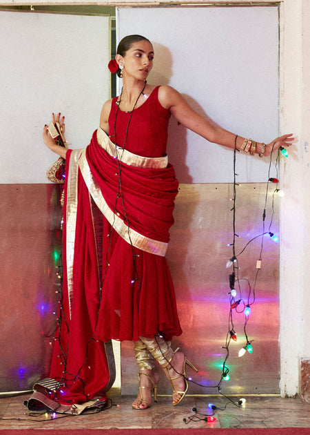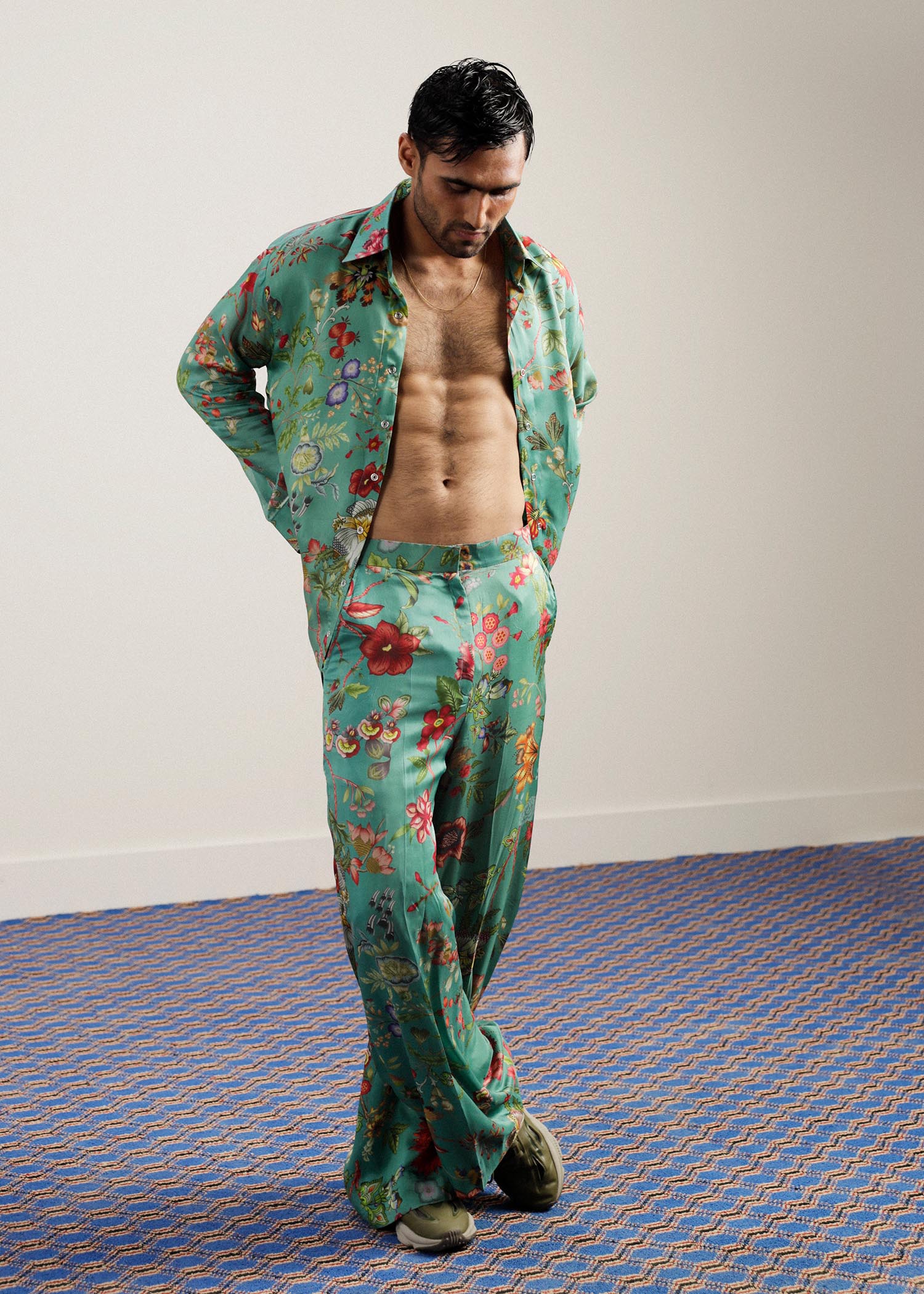 Made from pure raw silk this shirt is made by putting together stripes, the shirt is knee length long with the side slits and full sleeves with slits after each strips. The pant are also made in raw silk with three stripes at the side. The whole garment is fused & lined.